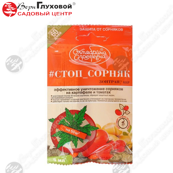 Средство для защиты садовых растений от сорняков «Зонтран» предназначено для уничтожения сорных трав на посадках картофеля и томатов. Раствор гербицида, нанесенный на почву, образует на ней защитную пленку, которая не допускает прорастания сорняков.